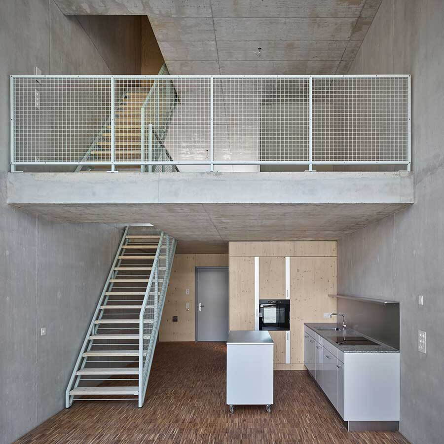 Das Gebäude mutet industriell an. Die Offenheit und Grosszügigkeit industrieller Architektur wird verbunden mit der notwendigen Geborgenheit und Komplexität der 50 Familienwohnungen. Allen Wohnungen gemeinsam sind Offenheit, Geborgenheit, Begegnungs- und Rückzugsorte.